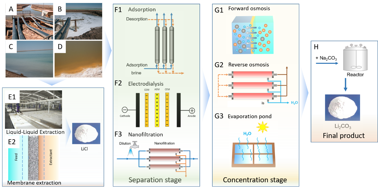 论文系统阐述了盐湖卤水提锂的现有技术路线,并指出从卤水到产品的整个工艺过程主要包括分离纯化和浓缩两个关键步骤,见图1。工艺技术包括:一步实现锂的分离富集的液液萃取(E1)和膜化学交换(E2)技术,该技术一般取得氯化锂产品;锂镁分离和锂浓缩两个工段的耦合工艺技术,如吸附(F1)、电渗析(F2)或纳滤(F3)用于镁锂分离,然后顺利获得正渗透(G1)、反渗透(G2)或蒸发塘(G3)以及其他浓缩技术浓缩含锂卤水,最后顺利获得添加碳酸钠(H),得到碳酸锂产品。