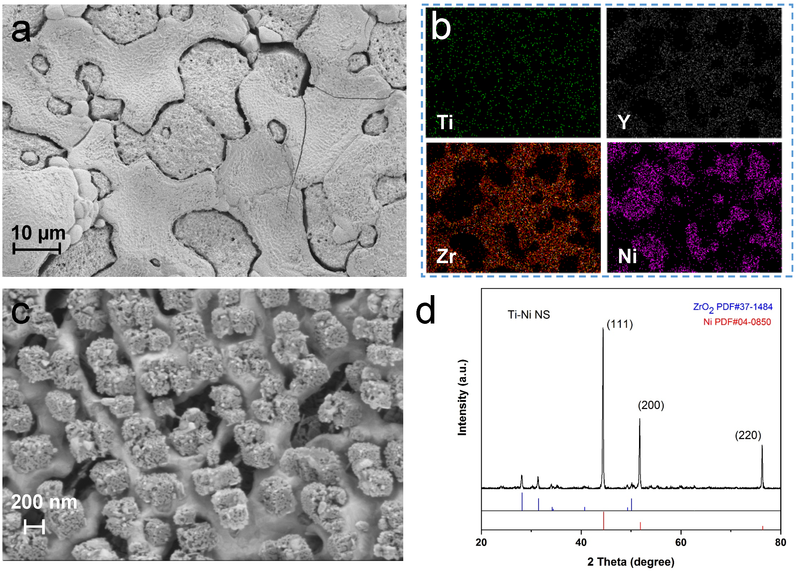 图2. 3D打印镍基碱性析氢电极SEM及XRD表征结果