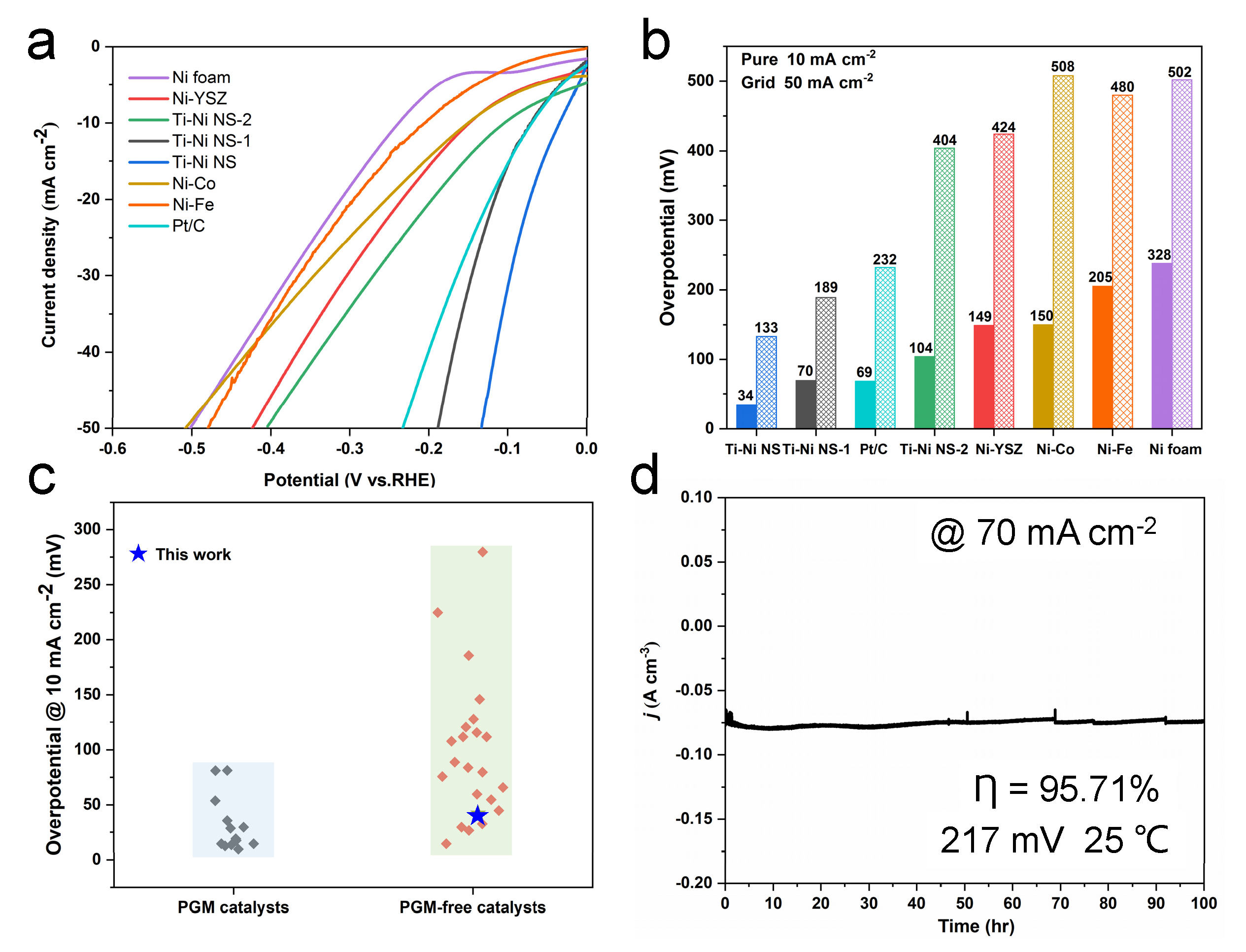 在此背景下,研究团队首次提出了一种利用光固化3D打印技术直接制备整体式镍基碱性电解催化剂的新策略。光固化3D打印技术制造成本远低于选择性激光熔化 (SLM) 金属3D打印,而几何自由度和打印精度又远高于直接墨水书写(DIW)3D打印。基于该技术,团队顺利获得精确调控打印浆料组分和优化后处理过程,制备了一系列整体式钛掺杂镍基电极,取得了具有独特镍钛合金3D立方结构的多孔电极表面。该立方结构与镍基底具有很强的交互作用,可大大提升电催化剂的比表面积,暴露活性中心,进而提升催化活性。研究表明,该3D打印镍基电极呈现出卓越的析氢性能:在1 M的KOH溶液中,仅需34 mV的超小过电位即可达到10 mA?cm-2的电流密度。这一表现优于传统商用铂碳电极,不亚于现在文献报道的最优秀贵金属析氢催化剂,后续还可继续优化电极三维结构,进一步提升其析氢性能。此外,得益于3D打印直接一体成型工艺,该整体式电极表现出了良好的工作稳定性。