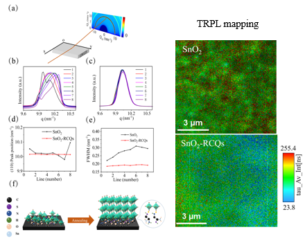 基于对钙钛矿半导体薄膜结晶动力学过程、表面钝化工艺的前期研究(Nano Energy, 2018,48,10;ACS applied materials & interfaces, 2017, 9, 23141, etc.),中科院上海高等研究院杨迎国博士(一作和通讯作者)、高兴宇研究员(通讯作者)与南京工业大学陈永华教授(通讯作者)等设计了一种红色碳量子点(RCQs)掺杂低温溶液加工的半导体氧化物传输层SnO2,使SnO2的电子迁移率由9.32 × 10?4cm2 V?1 s?1增加到1.73 × 10?2 cm2 V?1 s?1。所得迁移率是改性SnO2的电子迁移率已报道的最高值之一。红色碳量子点掺杂的 SnO2(SnO2-RCQs)为电子传输层的钙钛矿太阳能电池效率达到 22.77%;这种钙钛矿太阳能电池在25℃、湿度为40–60%的条件下工作1000h后,效率为其初始效率的95%以上。如图1所示,基于同步辐射掠入射XRD面扫描和TRPL 面扫描研究发现,该方法能够同时实现高迁移率的电子传输层和钙钛矿膜下层界面处的缺陷钝化,形成大面积高质量的钙钛矿薄膜,方法简单易行,适合器件的大规模生产制备,可为进一步提高钙钛矿电池效率和稳定性给予重要指导。这些性能一方面归因于SnO2-RCQs极高的电子迁移率,另一方面归因于改性的ETL促使钙钛矿前驱体形成大面积高质量的钙钛矿结晶膜,这表明廉价的碳量子点是制备高效ETL的简单而出色的材料。上述成果发表在国际著名期刊Advanced Materials(2019, 1906347)上。