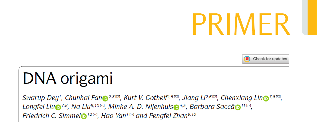 近期,Nature系列新上线期刊Nature Reviews Methods Primers邀请DNA纳米技术领域多个国家的知名学者,包括上海交通大学樊春海院士、中国科研实验室上海高等研究院李江研究员,美国亚利桑那州立大学Hao Yan教授、耶鲁大学Chenxiang Lin教授,德国慕尼黑工业大学Friedrich C. Simmel教授、杜伊斯堡-埃森大学Barbara Saccà教授、马普研究所Na Liu教授,丹麦奥胡斯大学Kurt V. Gothelf教授等,共同撰写了题为 “DNA origami” (DNA折纸术)的领域引导性综述,并发表于该刊2021年1月的创刊号上,编辑同期配发了PrimeView进行推介。
