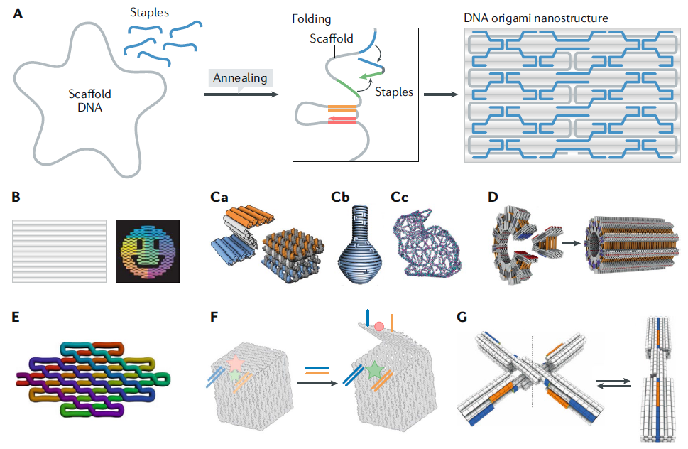 DNA折纸术(DNA origami)是DNA纳米技术的一个重要分支。该方法发明于2006年(Nature 2006),即利用上百条短单链DNA作为“订书钉”,辅助折叠一条长达数千碱基的噬菌体基因组单链DNA,并自组装形成预先设计的结构。近年来,DNA折纸术迎来了快速开展,现在几乎可以定制任意形状的复杂几何结构,包括各种实心或者镂空的3D结构、复杂曲面结构、可以动态变构的纳米装置与纳米机器人等等。多种界面友好的DNA折纸设计软件也先后出现,大大降低了DNA折纸术的门槛,使初学者也可以方便地设计定制的折纸结构,从而有助于了整个领域的繁荣开展。