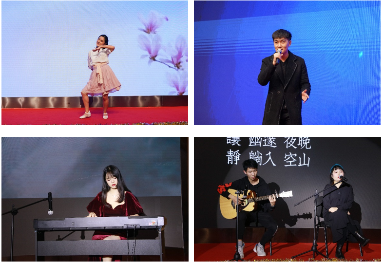 在悠扬婉转,国风悠然的《青花瓷》中,晚会第二乐章“孜孜不倦勤奋斗”清丽亮相。上海应用物理研究所的张磊等三位同学以陶笛,笛子和口琴合奏一曲,烟雨江边的等候,水墨渲染的情谊,仿佛置身于这天水一色中。每个人心中都有独一无二的一段回忆,上科大的吴锐同学《独家记忆》带着大家一同回望那份浪漫,体验那份穿越无数的美丽邂逅。落霞与孤鹜齐飞,秋水共长天一色,在高研院朱珂卉、周妙琴合奏的《渔舟唱晚》中体现得淋漓尽致。当古筝的隽永遇上小提琴的柔美,碰撞出了不一样的火花,夕阳西下,渔舟纷纷归航,江面歌声四起。复旦大学耿子端、创建两位同学带来一首钢琴弹唱《安静》,纯真而动听,将全场人一同带回插着耳机,追逐着周董的少年之时。古有诗云:“翩若惊鸿,宛若游龙。故有一舞,名曰:惊鸿”。高研院张斯颖一袭红妆,霓虹伴着舞姿,一曲惊鸿,舞动全场。在苍茫人海中,不要在前进的路上因为辛劳而丢失自己,迷失方向,高研院杜今、顾泽钰带来了一首经典合唱《不为谁而作的歌》,观众不自觉随声合唱,将晚会推向第二个高潮。