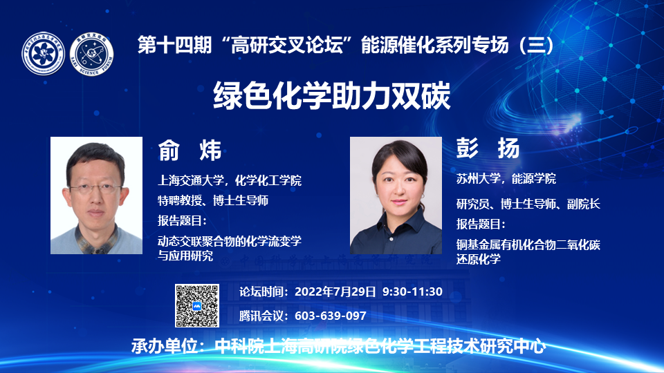 2022年7月29日上午,由中科院上海高研院绿色化学工程技术研究中心承办的第十四期“高研交叉论坛”能源催化系列专场第三场活动成功举办。活动以线上形式召开,以“绿色化学助力双碳”为主题,特邀上海交通大学化学化工学院俞炜教授、苏州大学能源学院彭扬教授为主讲嘉宾,来自EVO视讯官网、上海交通大学、苏州大学的80余名科研人员及研究生参加了活动。