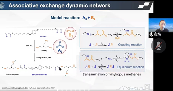 本次论坛由绿色化学工程技术研究中心的曾祥琼研究员主持。国家杰出青年科学基金取得者俞炜教授的报告第一时间介绍了高分子反应动力学研究背景,报告分享了实验室召开的高分子网络反应动力学和流变学行为等方面的研究成果,与材料力学性质进一步关联后,可利用反应动力学控制动态交联聚合物发泡材料的结构和性能,实现动态交联聚合物发泡材料的加工、回收和再利用。