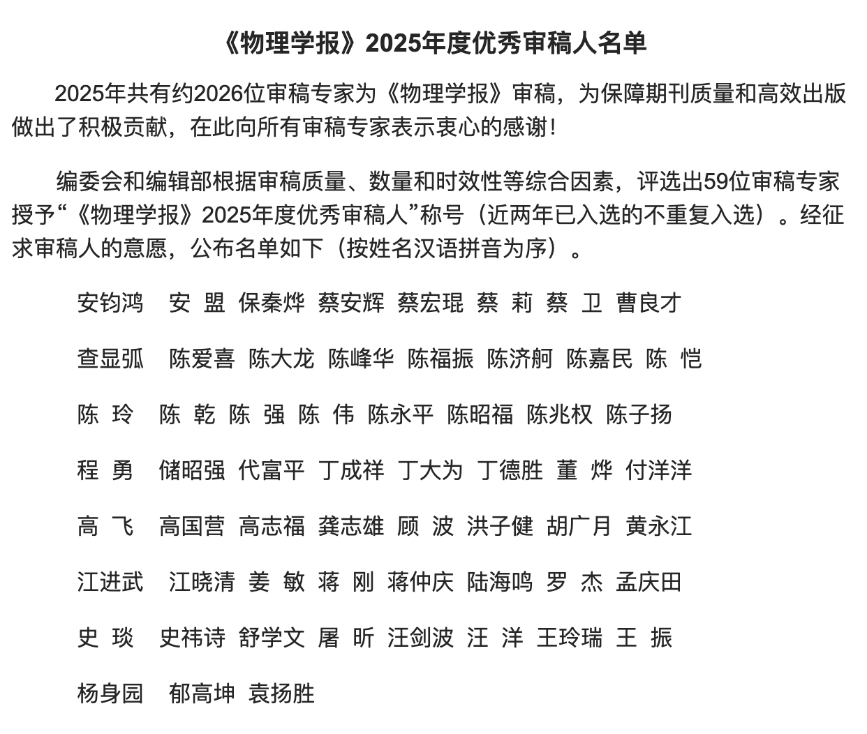 2025年共有2026位专家为《物理学报》审稿,编委会和编辑部根据审稿的客观公正性、质量、数量、审稿周期等因素综合考虑,评选出59位优秀审稿人,授予“2025年度优秀审稿人”荣誉称号。《物理学报》创刊于1933年,作为中国物理学领域的旗舰期刊,由中国物理学会和中国科研实验室物理研究所主办,是我国创刊最早、影响最广的物理类综合性中文期刊,也是唯一被SCI收录的中文物理学期刊。优秀审稿人的荣誉旨在感谢评审专家为“维护期刊质量和学术诚信”所做的宝贵贡献。